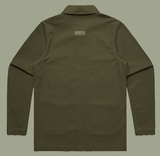 'I AM OASIS' Premium Cotton Chore Jacket in Black or Military Green with Sage Green Logos